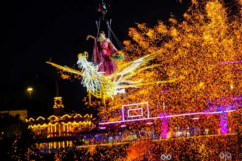 重慶歡樂谷舉行了新春大妙會(huì)活動(dòng),集水陸空立體非遺大秀、百場(chǎng)非遺演藝、多種民俗互動(dòng)、年味萬(wàn)福市集等于一體,以傳統(tǒng)與現(xiàn)代碰撞的獨(dú)特魅力為游客奉上沉浸式的地道年味體驗(yàn)。其中,非遺大秀在夜幕中璀璨亮相,1600℃的鐵水揮灑成漫天花火,演員化身“天女”撒下花瓣雨,湖面的龍船、火鳳凰、風(fēng)火輪等裝置火光綻放,光影成趣,水陸空一體聯(lián)動(dòng),驚艷絕倫;川劇變臉、潮汕英歌舞、福建游神、電音三太子等百場(chǎng)非遺演藝,讓游客可一站式領(lǐng)略全國(guó)傳統(tǒng)文化魅力,吸引絡(luò)繹不絕的游客前往。