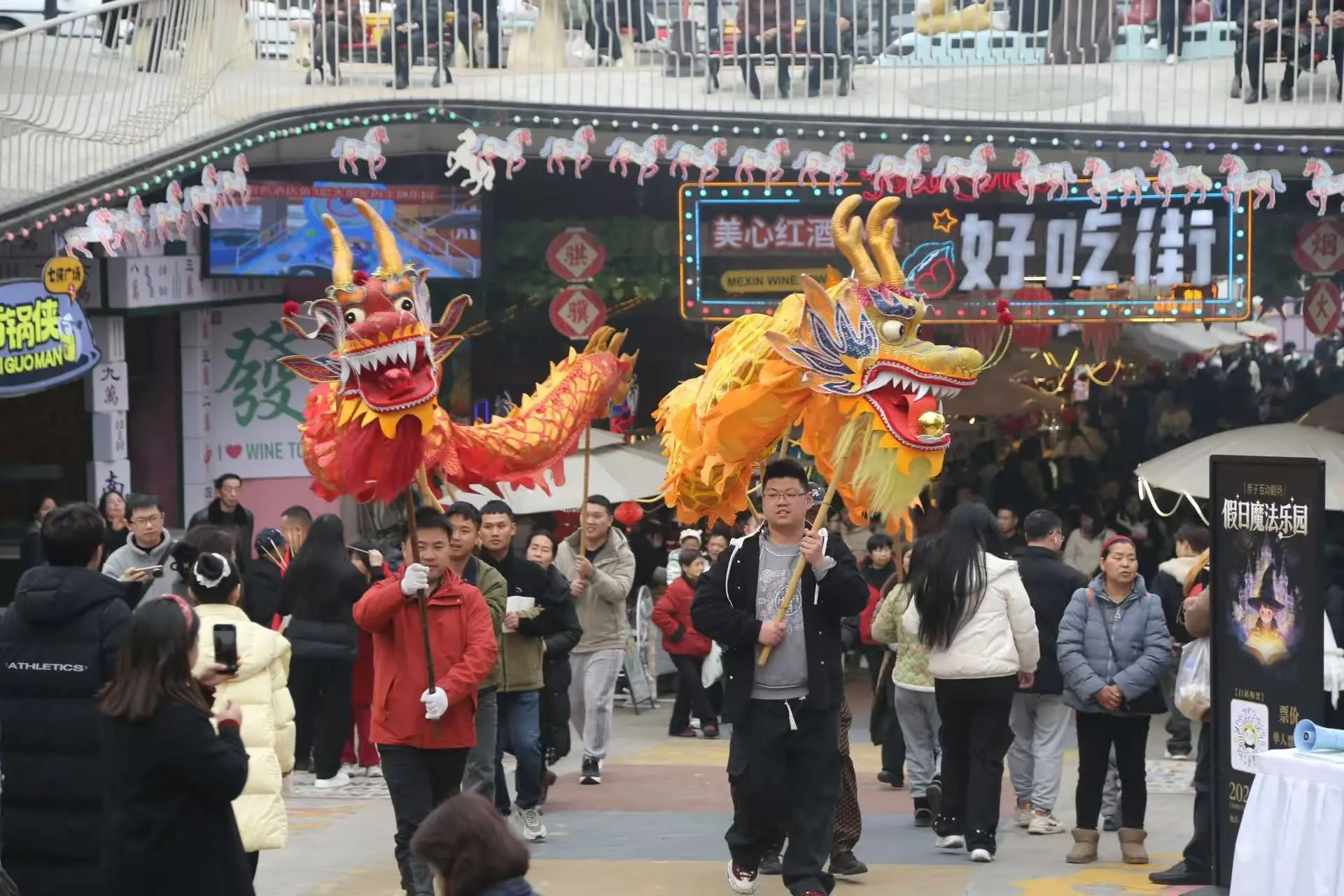 涪陵美心紅酒小鎮(zhèn)景區(qū)更是打破傳統(tǒng)景區(qū)“臺(tái)上表演、臺(tái)下觀看”的模式,全面轉(zhuǎn)向以游客為主導(dǎo),全民參與、沉浸式互動(dòng)的新春玩法,把游客真正“寵”進(jìn)濃濃年味里。除了舞龍舞獅、民俗巡游、財(cái)神送福等經(jīng)典項(xiàng)目外,游客還可以穿戲服、持龍具、跟著鼓點(diǎn)一起巡游,親身感受傳統(tǒng)年俗的熱鬧與儀式感,從“圍觀者”變身“參與者”,讓年味更足、歡樂加倍。15日至17日,景區(qū)人氣持續(xù)火爆,日均接待游客超6萬(wàn)人次,成為重慶近郊新春出游的熱門之選。
