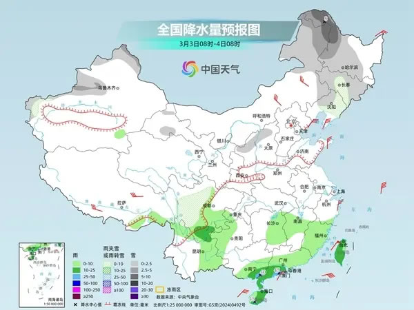 明天,內蒙古東北部、東北地區(qū)大部、新疆北部、川西高原等地部分地區(qū)有小到中雪或雨夾雪,內蒙古東北部、黑龍江西部等地部分地區(qū)有大雪;西藏東南部、西南地區(qū)東部、江南中西部和南部、華南中南部、臺灣島等地部分地區(qū)有小到中雨,廣西東南部沿海、廣東西南部、海南島西南部等地部分地區(qū)有大雨。