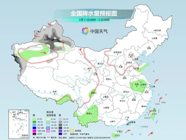 今明兩天,南方降水將明顯縮減,我國(guó)大部將呈現(xiàn)晴多雨少的天氣格局,不過(guò)新疆等地的雨雪會(huì)開(kāi)始增多,部分地區(qū)降雪較強(qiáng)。后天起,雨雪范圍將逐漸向東擴(kuò)展,西北、西南、江南、華北、東北等地將迎來(lái)一輪大范圍降水過(guò)程。