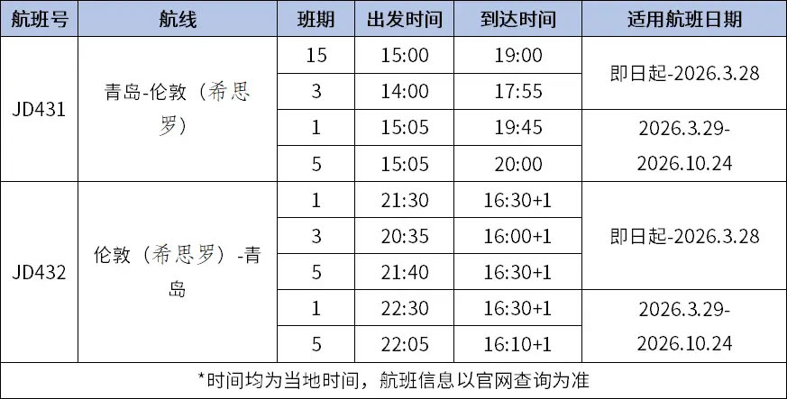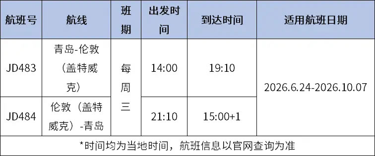 2026年夏秋航季重啟的青島往返倫敦(蓋特威克)航線,每周三固定執(zhí)飛,采用空客A330寬體機型,為英國旅客進入中國華東地區(qū)搭建直達橋梁。借助青島航空樞紐的輻射作用,該航線可聯(lián)動國內(nèi)多地航線,實現(xiàn)英國旅客來華后的無縫銜接。具體航班時刻如下(均為當?shù)貢r間,航班信息以官網(wǎng)查詢?yōu)闇剩?/p>