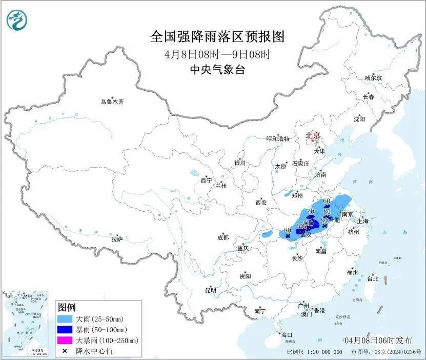 預(yù)計(jì),4月8日8時(shí)至9日8時(shí),湖北南部和東部、安徽中北部、河南南部、江蘇中北部等地部分地區(qū)有大到暴雨,其中,湖北東部局地有大暴雨(100~150毫米)。上述部分地區(qū)伴有短時(shí)強(qiáng)降水(最大小時(shí)降雨量20~40毫米,局地可超過(guò)50毫米),局地有雷暴大風(fēng)或冰雹等強(qiáng)對(duì)流天氣。
