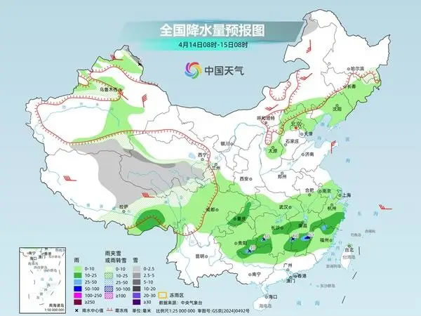預計未來三天,南方降雨較過去幾天有所減弱,但范圍仍廣泛,同時青藏高原多地仍有明顯降雪。中央氣象臺預計,今天,新疆阿勒泰北部和南疆盆地、西藏北部、青海東部和南部、甘肅河西和南部、川西高原北部以及內蒙古中部、黑龍江北部等地部分地區(qū)有小雪或雨夾雪,其中,新疆阿勒泰北部、西藏北部、青海西南部等地部分地區(qū)有中到大雪;西藏東南部、四川盆地西部、西南地區(qū)東北部、江南大部、湖北南部、廣西北部等地部分地區(qū)有中到大雨,其中,湖南東南部、江西東北部等地局地有暴雨。