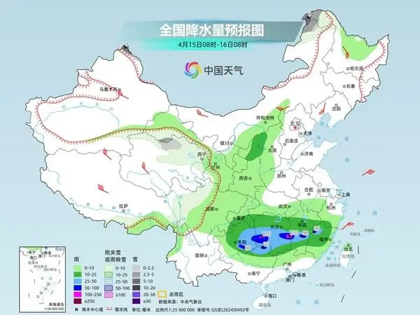 昨天,南方仍有大范圍降雨,同時青藏高原多地出現(xiàn)降雪天氣。監(jiān)測顯示,昨天8時至今天6時,湖南南部、江西南部、福建西北部等地部分地區(qū)出現(xiàn)中到大雨,湖南衡陽、江西贛州等局地大暴雨;青海北部和東部、西藏東部、川西高原等地部分地區(qū)出現(xiàn)中到大雪或雨夾雪,四川甘孜局地暴雪。