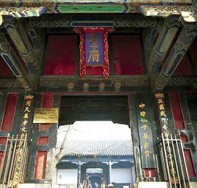 孔府位于曲阜城的中心,坐北朝南,迎面是一個粉白的大照壁,門前左右兩側(cè),有一對2米多高的圓雕雌雄石獅。紅邊黑漆的大門上鑲嵌著狻猊鋪首,大門正中上方的高懸著藍底金字的“圣府”匾額,門兩旁明柱上,懸掛著一對藍底金字對聯(lián):與國咸休安富尊榮公府第,同天并老文章道德圣人家。這副對聯(lián)相傳是清人紀均的手書。文佳字美,形象地說明了孔府在封建社會中的顯赫地位。這副對聯(lián)口氣之大自不待言,發(fā)人深思的是上聯(lián)“安富尊榮”的富字,下聯(lián)“文章道德”的章字,從上圖可以看出,“富”字上少了一 點,“章”字中多了一筆,意思是說衍圣公官職位列一品,田地萬