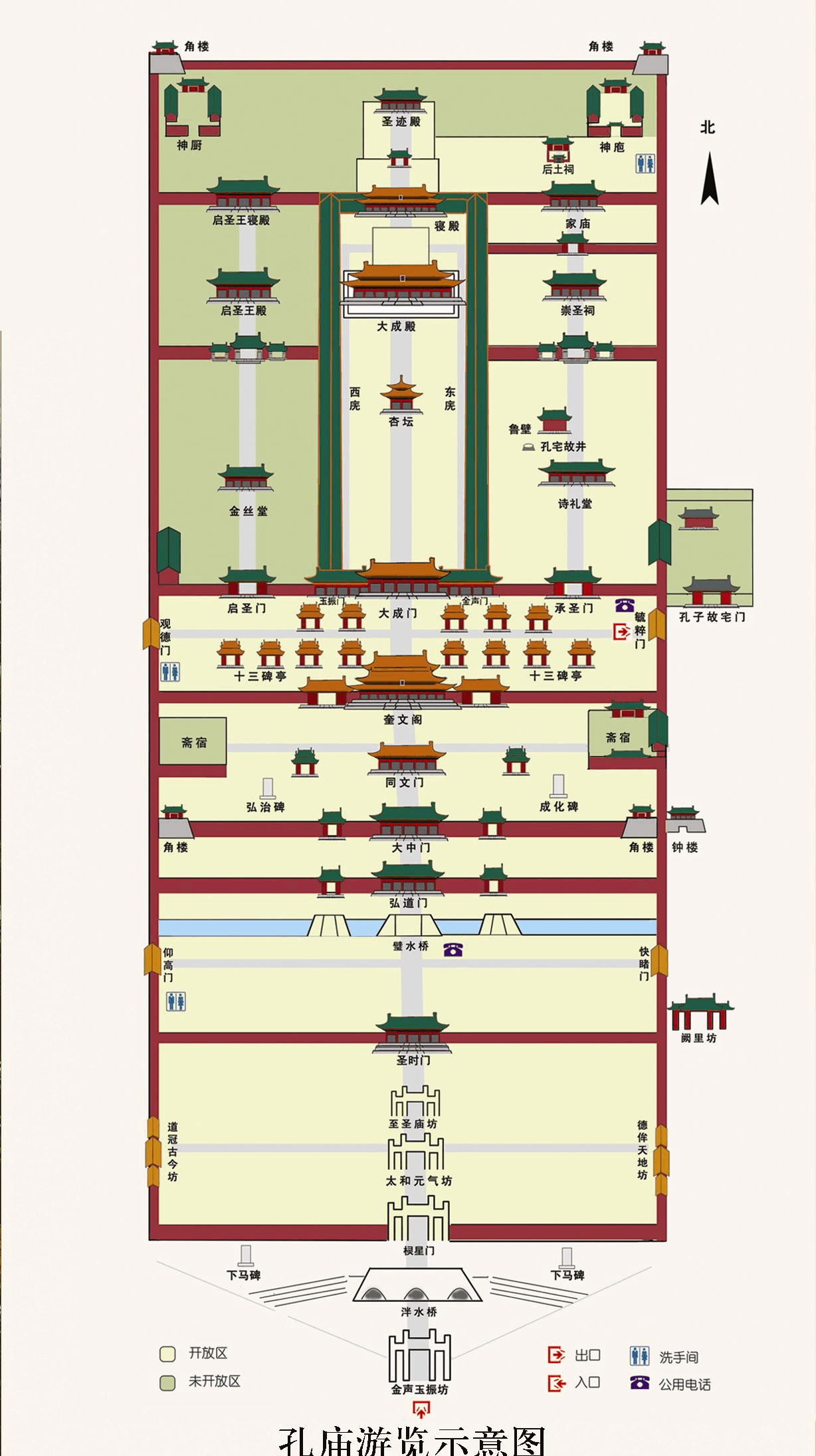 “大成”,是孟子對(duì)孔子的評(píng)價(jià)。他說:“孔子之謂集大成”,贊頌孔子達(dá)到了集古圣先賢之大成的至高境界。此處,五門大開,將孔廟分作三路:東為承圣門,內(nèi)奉祀孔子上五代祖先;西為啟圣門,內(nèi)奉祀孔子父母中路大成門,三門并立,左掖金聲門,右掖玉振門!敖鹇暋笔菗翮姷穆曇簦硎咀鄻分;“玉振”是擊磬的聲音,表示奏樂之終,用以象征孔子思想集古圣先賢之大成。中路主祭孔子夫婦,并以歷代先賢先儒配享從祀。