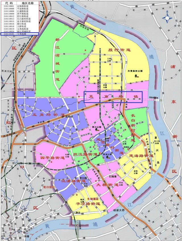 楊浦區(qū)轄12個街道:定海路街道、平?jīng)雎方值、江浦路街道、四平路街道、控江路街道、長白新村街道、延吉新村街道、殷行街道、大橋街道、五角場街道、新江灣城街道、長海路街道