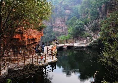 紅崖峽谷在太岳山西麓,屬太行山系,是中生代燕山運(yùn)動(dòng)時(shí)期隆起,又經(jīng)過新生代西馬拉雅運(yùn)動(dòng)改造形成的山地。其地貌屬大起伏喀斯特侵蝕中山,屬于石質(zhì)山區(qū),地貌類型多樣,巖石主要有片麻巖、花崗巖、石灰?guī)r和沙石巖。