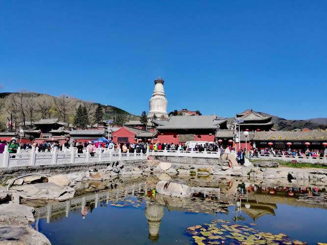 位于塔院寺后,現(xiàn)存建筑為明清兩代所修,寺宇面積八萬(wàn)余平方米,各種建筑四百余間。中軸線上殿堂七重,自前至后分別為觀音殿、文殊殿、大佛殿、無(wú)量殿、千缽殿、銅殿、藏經(jīng)殿。無(wú)量殿來(lái)說(shuō),高達(dá)21米,沒有一根梁木,全用磚塊砌成,外檐磚刻斗拱花卉,內(nèi)雕藻井懸空,形似花蓋寶頂,建造奇特。殿內(nèi)的《華嚴(yán)經(jīng)》字塔,為白綾所組成,上書60多萬(wàn)字的《華嚴(yán)經(jīng)》,蠅頭小楷,工整秀麗。銅殿三間見方,高達(dá)五米,外面雕鑄著花卉人物,飛禽走獸。