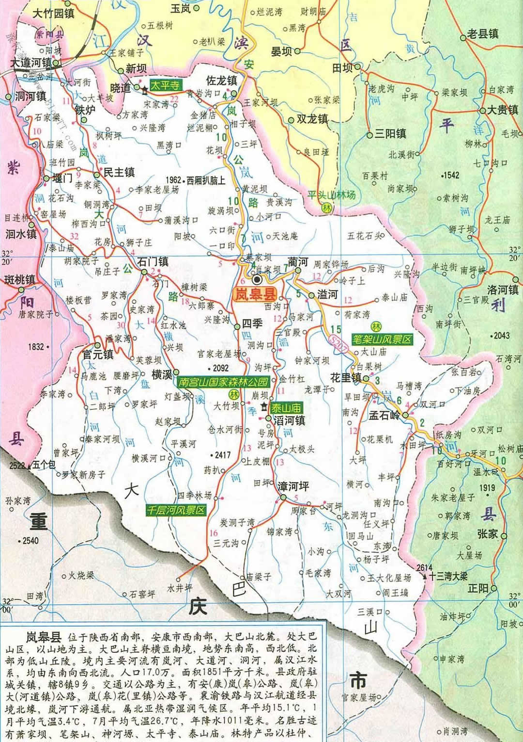 嵐皋縣位于陜西南部,大巴山北麓,南與重慶市城口縣接壤,北與安康市漢濱區(qū)、西與紫陽縣、東與平利縣相鄰,最高海拔2641米,最低海拔331米,北距安康市區(qū)71公里,全縣轄17個鄉(xiāng)鎮(zhèn)198個行政村,4.4萬戶,全縣總面積1956平方公里,人口17萬。其中農業(yè)人口15.2萬人,境內以山地為主,屬典型的亞熱帶大陸性季風氣候。