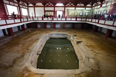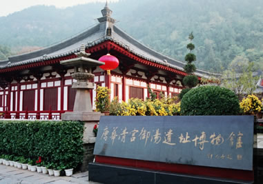 御湯遺跡:1982年4月,華清池內(nèi)基建時(shí),在今“貴妃池”西側(cè)發(fā)現(xiàn)了古建筑基址,省文管會考古隊(duì)即開始發(fā)掘考證。用了3年多時(shí)間發(fā)掘了約4000平方米的面積,發(fā)現(xiàn)了一條長18米、寬5.1米的唐代蛇形水源通道和4座青石砌成的浴池,還有大殿基址4處,發(fā)現(xiàn)30多米長的石墻和兩處蓮花踏步,總長400多米的陶管水道,長50米的磚砌水道及建筑材料多件。1983年7月,考古工作者在溫泉總源北部發(fā)掘出一個(gè)東西長10.6米,南北寬6米,深1.5米。輪廓呈蓮花瓣形的浴池遺址,池底及四周均用青石鋪砌,池內(nèi)有兩層臺,池底南有兩個(gè)圓形水口。專家根據(jù)史籍記載華清宮的御池方位、形制、規(guī)模和發(fā)現(xiàn)的浴池四周的大殿基址和柱礎(chǔ)等,認(rèn)為是唐玄宗使用的九龍殿蓮花湯。1984年10月在緊挨蓮花湯西北處,發(fā)掘出一個(gè)保存完好的海棠花形狀的浴池,東西長3.6米,南北寬2.9米,深1.26米,用青石砌成,池內(nèi)有二層臺階,池底正中有一圓形水口,做工考究,雕刻精細(xì),專家認(rèn)為是“海棠湯”,即唐玄宗御賜楊玉環(huán)的“貴妃池”。在蓮花湯西南還發(fā)掘出一個(gè)東西長5米,南北寬2.7米,深1.2米,用青石鋪砌的長方形浴池。據(jù)文獻(xiàn)記載推測,應(yīng)是“太子湯”。經(jīng)考證,這些古建筑遺存與史志書記載完全吻合,是一組較完整的唐華清宮建筑遺址,也是華清宮的中樞所在,為唐玄宗和貴妃游幸時(shí)活動的主要場所。期已經(jīng)全面整理,并仿唐形制,建成“唐華清宮御湯遺址博物館”供游人參觀。