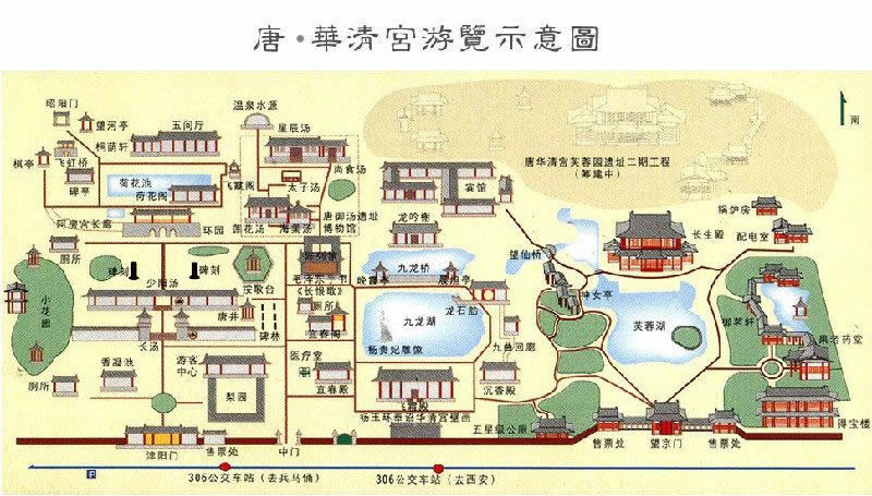 從文獻(xiàn)記載和野外的實(shí)際考察中,大抵可知華清宮的范圍是:南至驪山西繡嶺第一峰(即周烽火臺),北到今縣城北什字。東至石甕谷(寺溝)。西到鐵路療養(yǎng)院西側(cè)的牡丹溝。宮城(即羅城),南至山根,北到今縣城南什字,東至東窯村,西到游泳池。1967年新華書店在南什字西北角修建營業(yè)樓,發(fā)現(xiàn)了用青石砌成的宮城北墻的墻基。1981年春,城建單位在西街丁字形路北,也發(fā)現(xiàn)了同樣的北墻基。1982年冬于寺溝村南的山坡上探出東繚墻兩段。從調(diào)查和發(fā)掘所見遺跡及文獻(xiàn)資料所記,華清宮的建筑布局嚴(yán)謹(jǐn),曲折縈回,規(guī)模宏大。唐玄宗以民脂民膏,建此豪華宮苑,供一己之歡娛,然曾幾何時(shí),“漁陽鼙鼓”驚破了他的美夢。華清宮樓殿湯池,遂漸次破壞,自宋以至明清,其原有建筑已蕩然無存。記其遺跡,乃以彰我民族之文化,并以此為借鑒,建立一個(gè)新時(shí)代的風(fēng)景旅游區(qū),供廣大人民群眾游覽。唐代華清宮充分利用了有利地形,使其成為一座結(jié)構(gòu)嚴(yán)謹(jǐn)、富麗堂皇的龐大宮殿建筑群。主要殿舍以溫泉為中心,構(gòu)成華清宮的核心。然后向山上和山下展開,利用地形特點(diǎn),布設(shè)不同類型和用途的樓閣亭榭,同時(shí)還有青松翠柏、荔枝園、芙蓉園、梨園、椒園、東花園等分布其間,把整個(gè)華清宮妝扮得格外妖嬈。華清宮的建筑依山面水,鱗次櫛比,除宮城(羅城)外,還有繚墻環(huán)繞?潐χ,又羅列不少建筑,清乾隆《臨潼縣志》稱:“湯井殊名,殿閣異制,園林洞壑之美,殆非人境”。