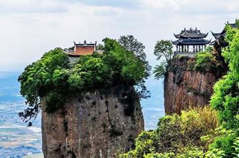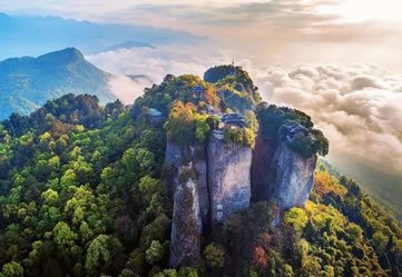 二絕鐵索飛渡:連接主峰的鐵索懸橋初建于唐代,先后換修6次。山上還有身懷絕技的飛人,在鐵鏈上表演,行走如風,被譽為“華夏一絕”。
