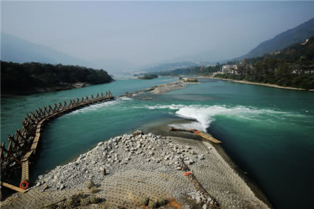 都江堰,位于四川省成都市都江堰市城西,坐落在成都平原西部的岷江上,是由渠首樞紐(魚(yú)嘴、飛沙堰、寶瓶口)、灌區(qū)各級(jí)引水渠道,各類工程建筑物和大中小型水庫(kù)和塘堰等所構(gòu)成的一個(gè)龐大的工程系統(tǒng),渠首占地面積200余畝。 它擔(dān)負(fù)著四川盆地中西部地區(qū)7市(地)40縣(市、區(qū))1130萬(wàn)余畝農(nóng)田的灌溉、成都市多家重點(diǎn)企業(yè)和城市生活供水,以及防洪、發(fā)電、漂水、水產(chǎn)、養(yǎng)殖、林果、旅游、環(huán)保等多項(xiàng)目標(biāo)綜合服務(wù),是四川省國(guó)民經(jīng)濟(jì)發(fā)展不可替代的水利基礎(chǔ)設(shè)施。