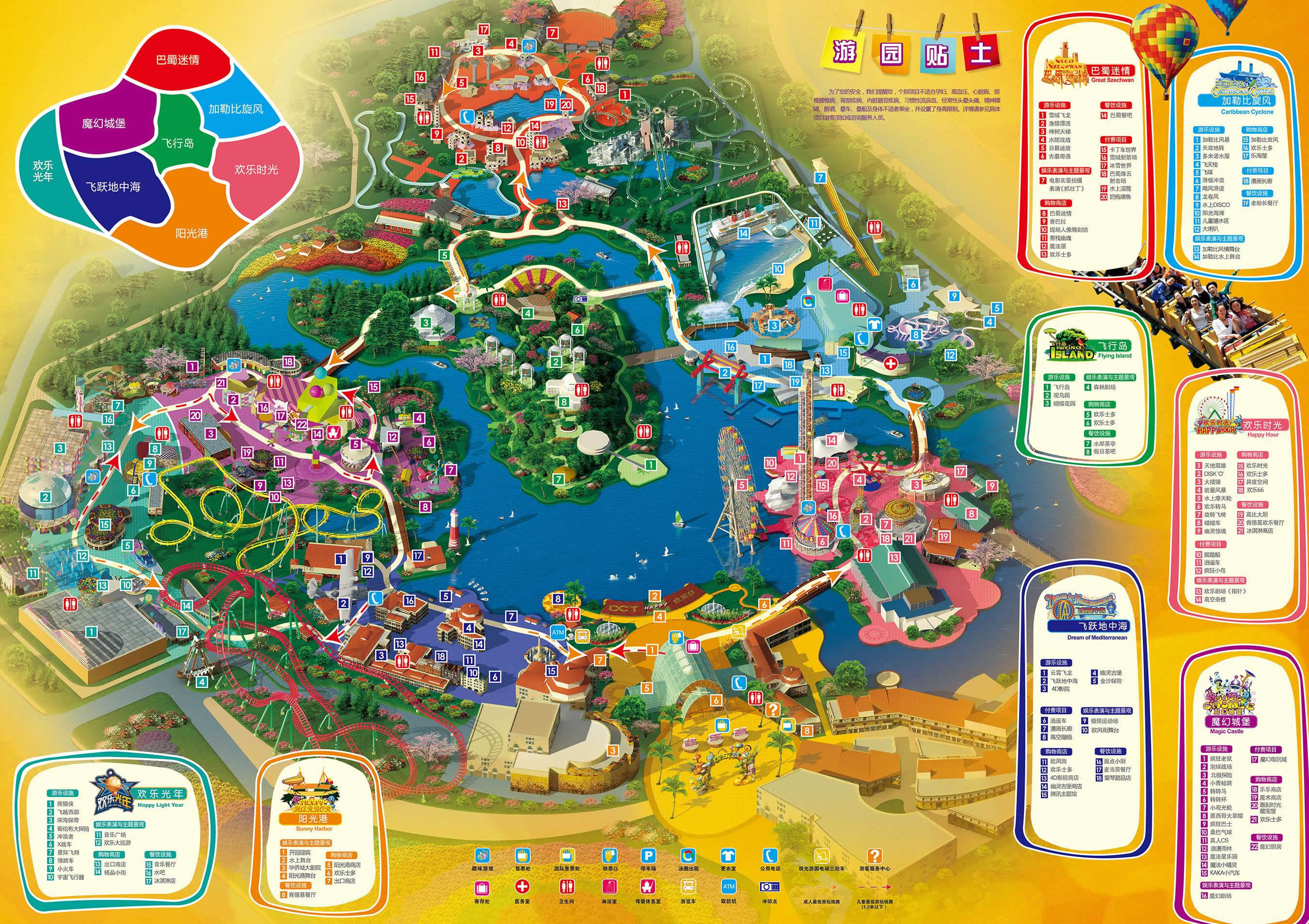 成都歡樂谷占地51萬平方米,由陽光港、歡樂時光、加勒比旋風、巴蜀迷情、飛行島、魔幻城堡、飛躍地中海、歡樂光年及絲路傳奇9大主題區(qū)域組成,擁有百余項景點。其中設(shè)置了159項體驗觀賞項目,包括超過54項娛樂設(shè)備設(shè)施、58處人文生態(tài)景觀、27項藝術(shù)表演、20項主題游戲和商業(yè)輔助性項目。