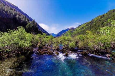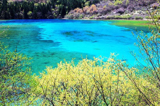 春風(fēng)吹拂,沉睡的九寨溝蘇醒了。冰雪融化,新綠發(fā)芽,春水的顏色映著山色,嬌嫩得讓人不忍探視,仿佛只要輕輕地一口氣都能讓它消失。水邊道旁,鬧哄哄開滿了不知名的美麗山花,桃紅、絳紫、靚藍(lán)、鵝黃,繁華似錦,爛漫一路。溫柔而慵懶的春陽(yáng)吻接湖面,愛撫春芽,也悸動(dòng)了你久閉的心門......