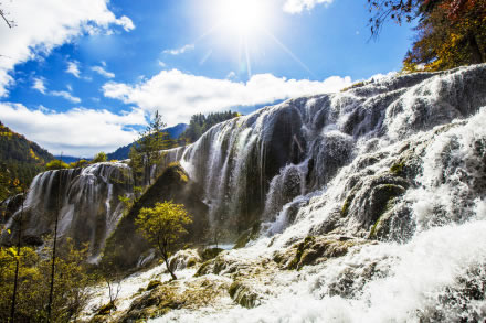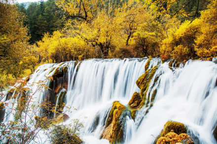 諾日朗瀑布海拔2343米,高24.5米、寬320米,是中國(guó)最寬的高山鈣華瀑布。滔滔流水自諾日朗群海而來,從瀑頂樹叢中傾瀉而下,像數(shù)條潔白的哈達(dá),水勢(shì)浩大,聲震山谷。寒冬時(shí)節(jié),瀑布成了一幅巨大的冰幔,無數(shù)的冰柱懸掛在陡崖之上,成為罕見的冰晶世界,造型各異的冰雕迎光透著幽幽的藍(lán)色魅惑,是九寨溝六絕之一“藍(lán)冰”。