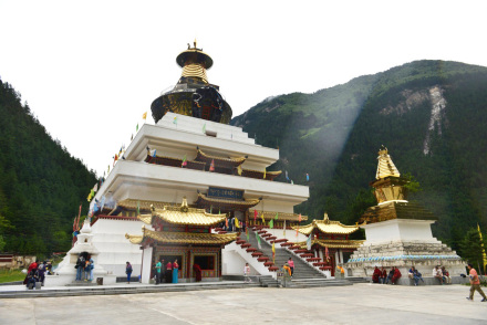 目前,九寨溝景區(qū)僅保留了樹正寨、荷葉寨、則查洼寨這三個(gè)村寨,善良淳樸的他們,用微笑迎接著前來九寨溝的每一個(gè)人。而在這些村寨中,最壯觀的莫過于樹正寨前的“九寶蓮花菩提塔”,七彩經(jīng)幡隨風(fēng)飄蕩,圣潔的白塔在陽(yáng)光下仿若閃著光,這里也是眾多游客到來時(shí),都會(huì)雙手合十,輕聲祭拜的地方。
