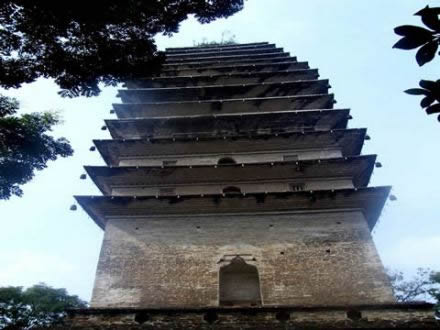 靈寶塔又名凌云塔,因其聳立在凌云寺后的靈寶峰巔,故以山峰命名。塔建于唐代,塔形呈密檐式四方錐體,磚砌而成,坐東向西,高38米,共十三級。塔體中空,內(nèi)確 ”石階沿塔軸盤旋至頂。塔頂為四角攢尖式。靈寶塔的結(jié)構和風格與西安小雁塔相似。