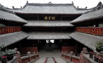 家慶堂屋頂為歇山頂,整個殿宇雄偉華麗,它的屋頂脊飾很有特色。正脊正中有三重樓閣,樓閣之上有寶頂,樓閣后底部雕塑有彌勒佛;9個脊梁之上都有蹲獸,在4個翼角戧脊之上塑有天上四靈,以正四方。什么是“四靈”呢?就是青龍、白虎、朱雀、玄武;為何要塑“四靈”?因?yàn)楣湃顺S小白簖堄一⒈俨幌,朱雀玄武順陰陽”的說法。在歇山下邊的正中位置,還有“上有仙人不知老,渴飲玉泉饑食棗”等生動有趣的裝飾性塑像。如果站在代表二十四孝的石階下仰望整個家慶堂時,更會有華麗多彩、猶如海市蜃樓的感覺。