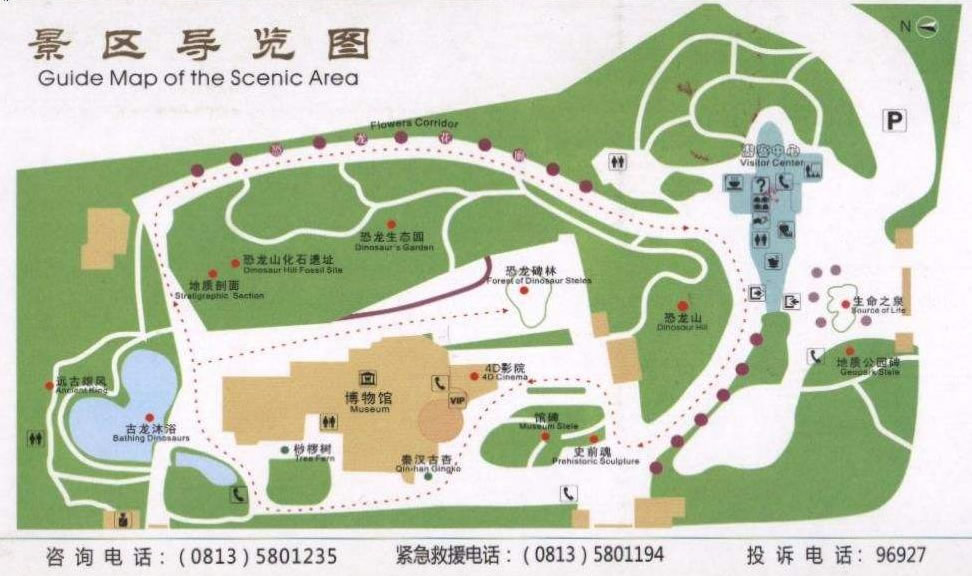 7.景致優(yōu)美?铸埐┪镳^主館造型獨(dú)特,猶如一堆巨石兀立在恐龍化石群產(chǎn)出地上。游客中心則似一具巨大的劍龍橫臥在洪荒古樸的亞熱帶叢林之中,二者交相輝映,相得益彰。園區(qū)內(nèi)有大量的鐵樹、銀杏、松柏等中生代植物,特別是移植了30余株與恐龍同時(shí)代有“活化石”之稱的植物——桫欏,充分地營造了恐龍生活的史前環(huán)境。整個(gè)園區(qū)環(huán)境優(yōu)美,風(fēng)景宜人,是一個(gè)旅游、休閑的絕佳場(chǎng)所。