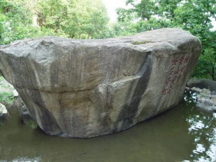 在東西浮青嶺之間山谷中,兩邊是險(xiǎn)峻的陡壁,清秀的峰巒,澗谷中彎曲的小溪,清流湍急。當(dāng)?shù)罊M臥一石,長(zhǎng)數(shù)丈,高丈余,上寬下窄,形同元寶,名元寶石,上鐫“此地有崇山峻嶺,怪石奇松。古檀寧椿,“古檀”是密云。寧椿是名字。古密云縣的一位舉人經(jīng)過(guò)這里,被盤山的美景吸引住了,他想用一句話來(lái)概括盤山的勝景,于是他便借用了晉代著名書(shū)法家王羲之的《蘭亭序》中有“此地有崇山峻嶺,茂林修竹”一句,他看到盤山松樹(shù)長(zhǎng)勢(shì)奇特,巖石形狀怪異。因而在這里留下了“此地有崇山峻嶺,怪石奇松”。