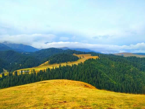 夏季,在每年的6、7月份是避暑消夏的季節(jié)。初到這里的人,會錯覺以為到了瑞士:沒膝的黨生花、貝母花和一種叫不上名的小黃花漫山遍野,就像神仙種植的一樣,在草地里自然生長為好幾層。爭奇斗妍,沁人心脾的花香令人陶醉;遠(yuǎn)處群山起伏,層巒疊嶂,連綿不斷,蒼松翠柏直插云霄,雪峰、林海和綠草鮮花構(gòu)成了一副秀麗的山水畫卷;行走在這綠茸茸、濕漉漉的草地上,涼風(fēng)習(xí)習(xí),盡情呼吸新鮮的空氣和花草的芳香,一種心靈被大自然凈化的感覺油然而生。再往里面走就是雪山,皚皚的積雪終年不化。騎馬可以到達(dá)雪山腳下,那里溫度急劇下降,剛才還是短褲T恤,就得穿上厚棉衣。身上還是烈日曬著,頭頂一朵云飄過,很可能就是一陣瓢潑大雨,讓你看著太陽卻渾身濕透。過一會雨停了,山風(fēng)已不知不覺吹干了你的衣服。
