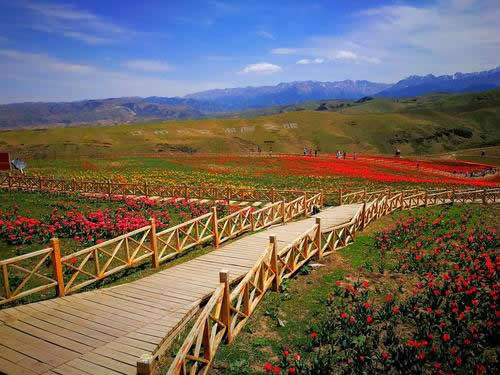 斷橋名字的由來有兩種說法:一種說法是,最初這里有一座橋,但總是會被水沖斷,故稱“斷橋”。另一種說法是,為了方便哈薩克牧民轉(zhuǎn)場時趕著牛羊通過,建在草地之上原本連續(xù)的木棧道,在此斷開一個缺口,得名“斷橋”。由此可直接踏上木棧道,沿路觀景,向上可仰觀氣勢磅礴的雪山、挺拔的松林,向下可俯視爛漫山花與草地上的牛羊,天山麥海、空中草原、林海雪峰,每一處景觀都美不勝收。
