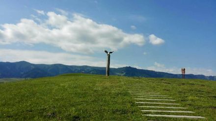 天上的云像是潔白的羊群圍繞著連綿的山峰,又像是奔騰的駿馬馳騁在山谷間。云霧相遇纏繞,仿佛置身于云海之中,故而得名天云臺(tái)。陪伴在天云臺(tái)身邊的是一幅巨型的草原姑娘浮雕,展示了哈薩克族女性的勤勞與善良,仿佛在說(shuō):“有朋自遠(yuǎn)方來(lái)不亦樂(lè)乎”。