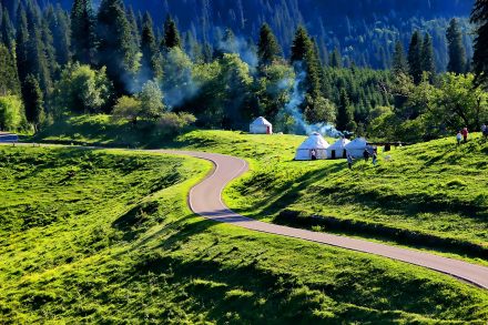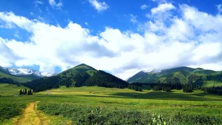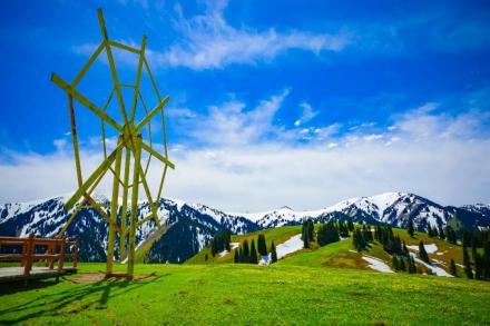 哈薩克語(yǔ)為“美麗的山溝”,是進(jìn)入河谷草原的第一站,擁有一山四景,白雪皚皚的山峰、茂密的森林、連綿起伏的山丘、平坦的草甸,是草原垂直自然景觀帶的窗口。其東側(cè)的山坡形似天山母親的耳朵,聆聽(tīng)著大地的聲音,默默守護(hù)著天山,被稱之為“天山之耳”。西南側(cè)的山坡形似一匹昂首奔騰的駿馬,見(jiàn)者“馬到成功,飛黃騰達(dá)”被取名為“飛馬坪”。