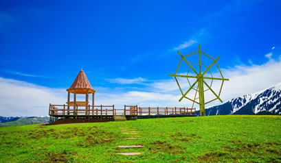 哈薩克語(yǔ)為草原會(huì)客廳,是古時(shí)候草原民族商量重大事宜的地方,現(xiàn)為景區(qū)河谷草原線路的綜合服務(wù)區(qū)?晒┯慰腕w驗(yàn)騎馬、射箭、民族服裝留念、古道馬車、草地摩托車、住宿、直升機(jī)觀景等娛樂(lè)項(xiàng)目、餐以及住宿服務(wù)。