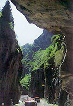 天池石門:景名為“石門一線”,海拔1500米,位于大天池以北5.9公里處,為一段被三工河古河道切割形成的石峽谷,這道山口是進(jìn)入風(fēng)景區(qū)的天然門戶;峽谷長約百余米,最窄處僅十來米寬,兩側(cè)直立的巖壁高逾數(shù)十米,形勢峻險,仰視見一線天,側(cè)邊盤繞三工河水。
