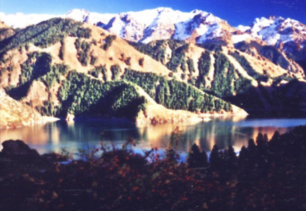 從鱷魚壩上南望博格達(dá)峰,這是天池八景的最后一景“南山望雪”,另外七景依次是以上提及的“石門一線”、“龍?zhí)侗淘隆、“懸泉飛瀑”、“定海神針”、“西山觀松”、“頂天三石”和“海峰晨曦”,以上有關(guān)此八景的《天池八景詩》由當(dāng)代詩人謝玉康所作。從鱷魚壩可擺渡到天池南岸,到南岸后繼續(xù)向南行。