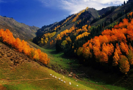 孜沿氈溝和馬鹿溝:溝谷內(nèi)谷深流急,濤聲隆隆,河水清涼純凈,河岸時而危巖矗立,時而寬闊平坦。溝谷內(nèi)植物依高矮不同分成5層,最高一層是云杉的圓錐形樹冠層,第2層是天山花楸,第3層是薔薇、忍冬、紅果小蘗,第4層是羽衣草、早熟禾、鹿蹄草、唐松草、天山鳶尾、高山羊角芹等200多種草本植物層,第5層是苔蘚、地衣。它們或相互依存,或獨在一方,把中山峽谷裝點得千種姿態(tài)、萬種風(fēng)情。溝谷內(nèi)野生動物種類繁多,獸類有馬鹿、狍子、野豬、棕熊、狐貍、猞猁、石貂、艾虎、野兔等,鳥類有石雞、斑翅山鶉、黑鸛、柳鶯、星鴉、金額熊雀、紅額金翅雀、朱雀、鳶尾等。