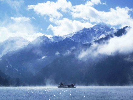 三江河洪水:即“南湖黃龍”,三江河水從大天池南段入湖處,由于博格達(dá)山區(qū)夏季降水較多,常暴雨盆潑,三工河上游集水面積有168平方公里,河水每當(dāng)大雨洶涌北瀉,從天池北南望。