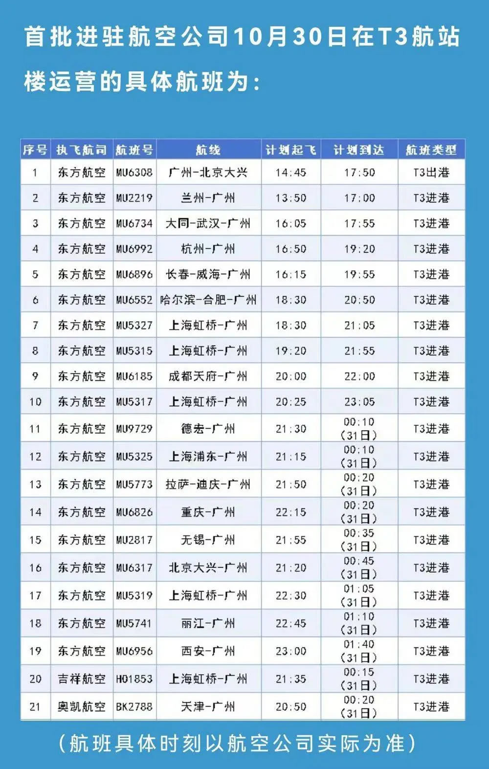 10月31日起,東方航空、上海航空、中國聯(lián)合航空、吉祥航空、奧凱航空的國內進出港航班均調整至白云機場T3航站樓運營,東方航空的國際航班暫保留在T1航站樓運營。