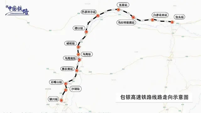 包銀高鐵起自包頭站,經(jīng)內(nèi)蒙古自治區(qū)包頭市、巴彥淖爾市、鄂爾多斯市、烏海市,寧夏回族自治區(qū)石嘴山市、銀川市,接入銀川站,正線全長519公里,設(shè)計時速250公里,實行分段建設(shè)。其中,惠農(nóng)至銀川段全長97公里,已于2024年10月開通運(yùn)營,此次開通的包頭至惠農(nóng)段全長422公里,共設(shè)包頭、白彥花西、烏拉特前旗、五原、巴彥淖爾、磴口、堿柜、烏海、烏海南、惠農(nóng)南10座車站,其中包頭、巴彥淖爾、烏海、惠農(nóng)南站為既有車站,其余車站為新建車站。
