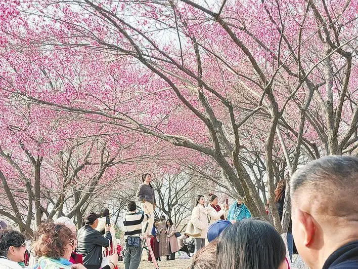 雖是工作日午后,坡上已有數(shù)百位市民游客漫步賞玩;ㄓ叭顺敝,除了專程而來的攝影愛好者架起“長(zhǎng)槍短炮”,更有許多家庭扶老攜幼,在梅林間游玩、野餐。曾是約拍行業(yè)淡季的隆冬時(shí)節(jié),也成了旺季。“花期比往年早了近一個(gè)月,好幾個(gè)周末的‘約拍’都排滿了。”攝影愛好者周女士邊調(diào)整鏡頭邊說。據(jù)攝影師“四葉草”介紹,周末這里人流如織,即便今天是工作日,前來拍照的游客依然不少。“目前‘梅花坡’花開得最盛,大家都搶著來出片,競(jìng)爭(zhēng)壓力不小。眼下的梅花是開年第一波熱度。”