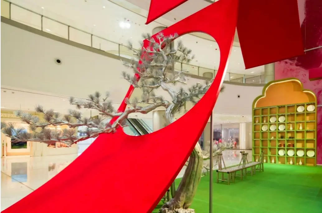 山水,并非遠(yuǎn)行才可得見。書法水墨藝術(shù)家劉玥首展作品《春山行遠(yuǎn)圖》以20米巨幅“山水開卷”,步入其中,與天地春意從容照面;紅色的帷幔落于銀色的松枝上,就像于山間松下靜謐的一隅,“幕下棲心”將是絕佳開年時尚大片的打卡處;松下銀椅,為你與摯友“漫敘往來”的相聚時刻營造出寧靜、松弛的氛圍;多寶閣中陳列著未經(jīng)雕琢的茶器素胚與場內(nèi)品牌萬仟堂,長沙尼依格羅酒店及tea'stone帶來的新春茶器,以“初芒蘊能”詮釋著未來的無限可能與新生力量。轉(zhuǎn)身與“蒔光種愿” 四方亭相遇。葫蘆門朝四方而開,寓意著納四方福祿,步入其中,與數(shù)字交互藝術(shù)家吳旭首展作品《無限福祿》體驗互動,跟隨指引揮動手勢,觸發(fā)粒子凝聚為動態(tài)“福”字,親手完成一場新春祈福儀式。我們把象征團(tuán)圓與喜悅的紅色沙發(fā)打造“盞間聚暖”,如懷抱般圍合的布局作為“歸處”的隱喻。與家人團(tuán)聚便是心歸處,這將是中國年最圓滿的意象。
