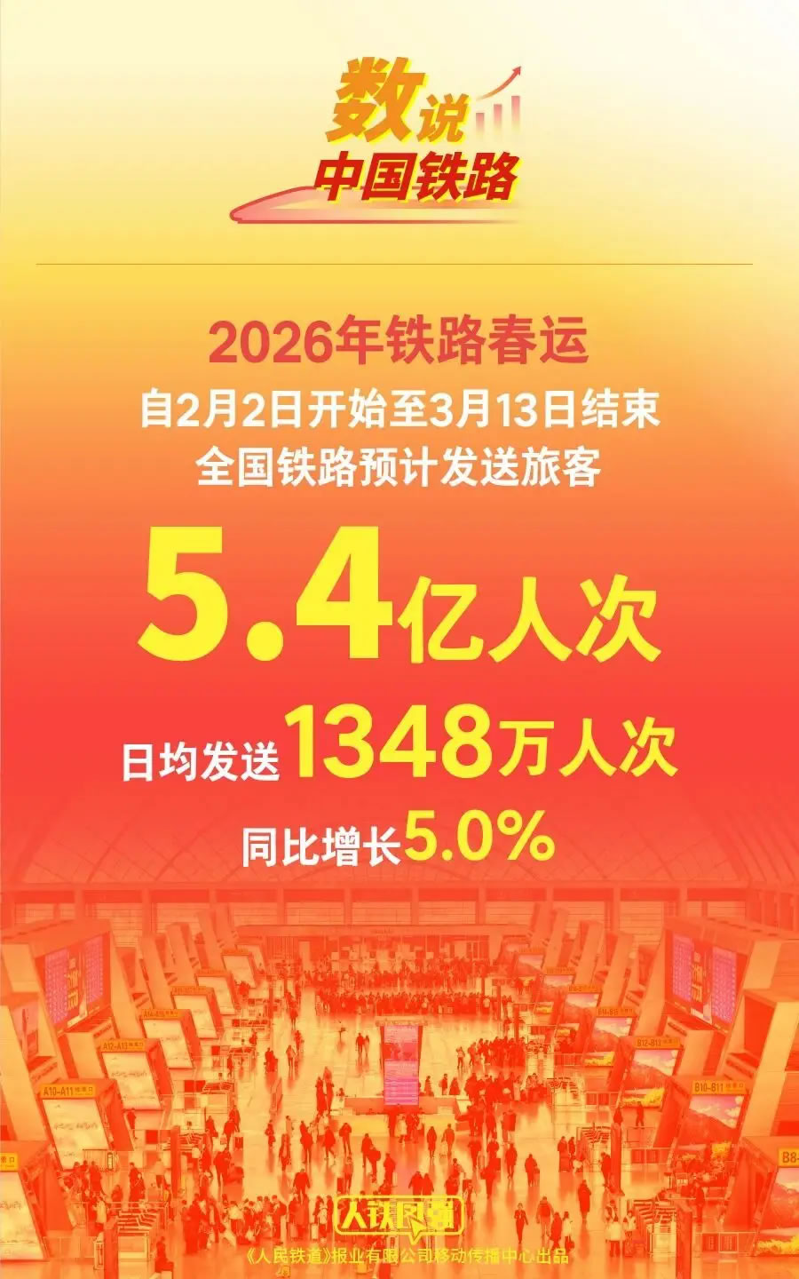 2026年鐵路春運(yùn)今日啟動(dòng),自2月2日至3月13日結(jié)束,為期40天,全國鐵路預(yù)計(jì)發(fā)送旅客5.4億人次,日均發(fā)送1348萬人次、同比增長5.0%。