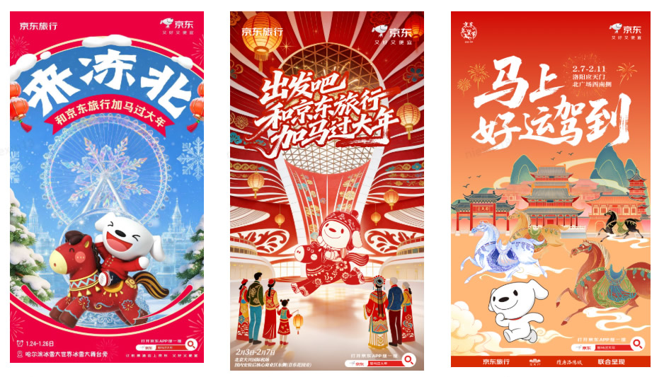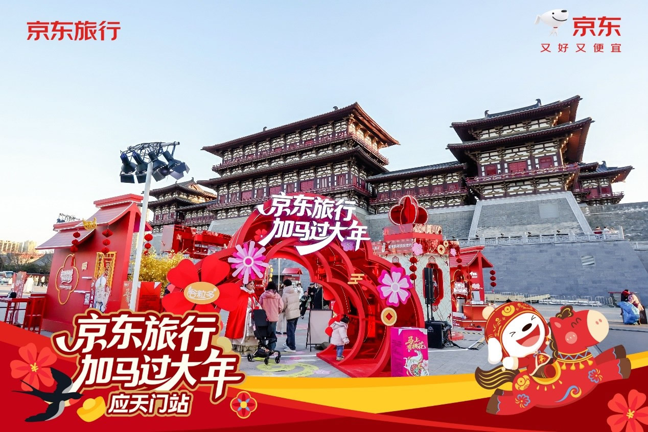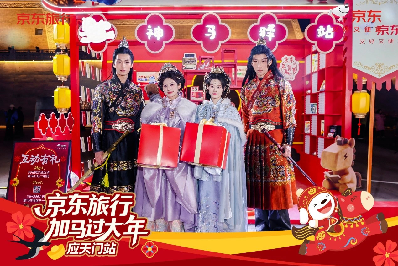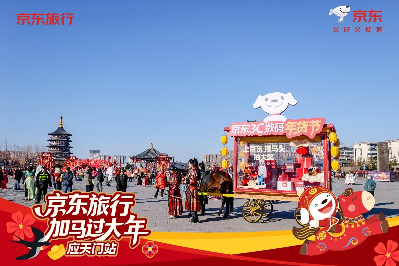 與此同時(shí),在洛陽(yáng)應(yīng)天門景區(qū),京東旅行攜手京東數(shù)碼、京東物流、伊利等品類品牌,以“國(guó)風(fēng)快閃”為核心形式,融合真實(shí)馬匹巡游、唐風(fēng)NPC互動(dòng)、馬車送年貨等話題事件,將傳統(tǒng)文化場(chǎng)景與品牌產(chǎn)品自然嫁接,不僅強(qiáng)化了景區(qū)文化體驗(yàn)的鮮活感,更通過(guò)“真馬營(yíng)銷”等創(chuàng)新手段在社交平臺(tái)形成二次傳播,成功塑造了“文旅+品牌”的場(chǎng)景營(yíng)銷新范式。