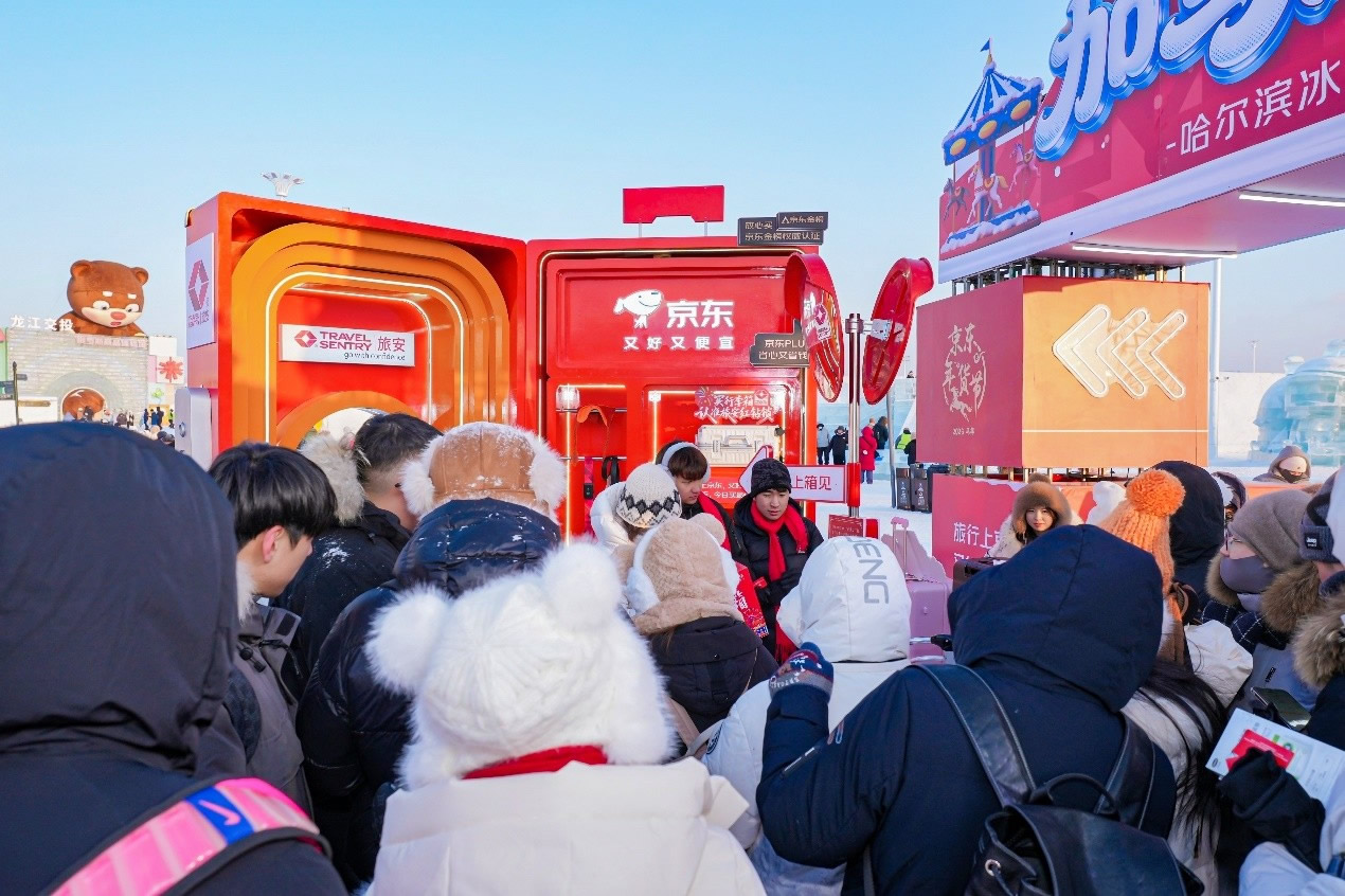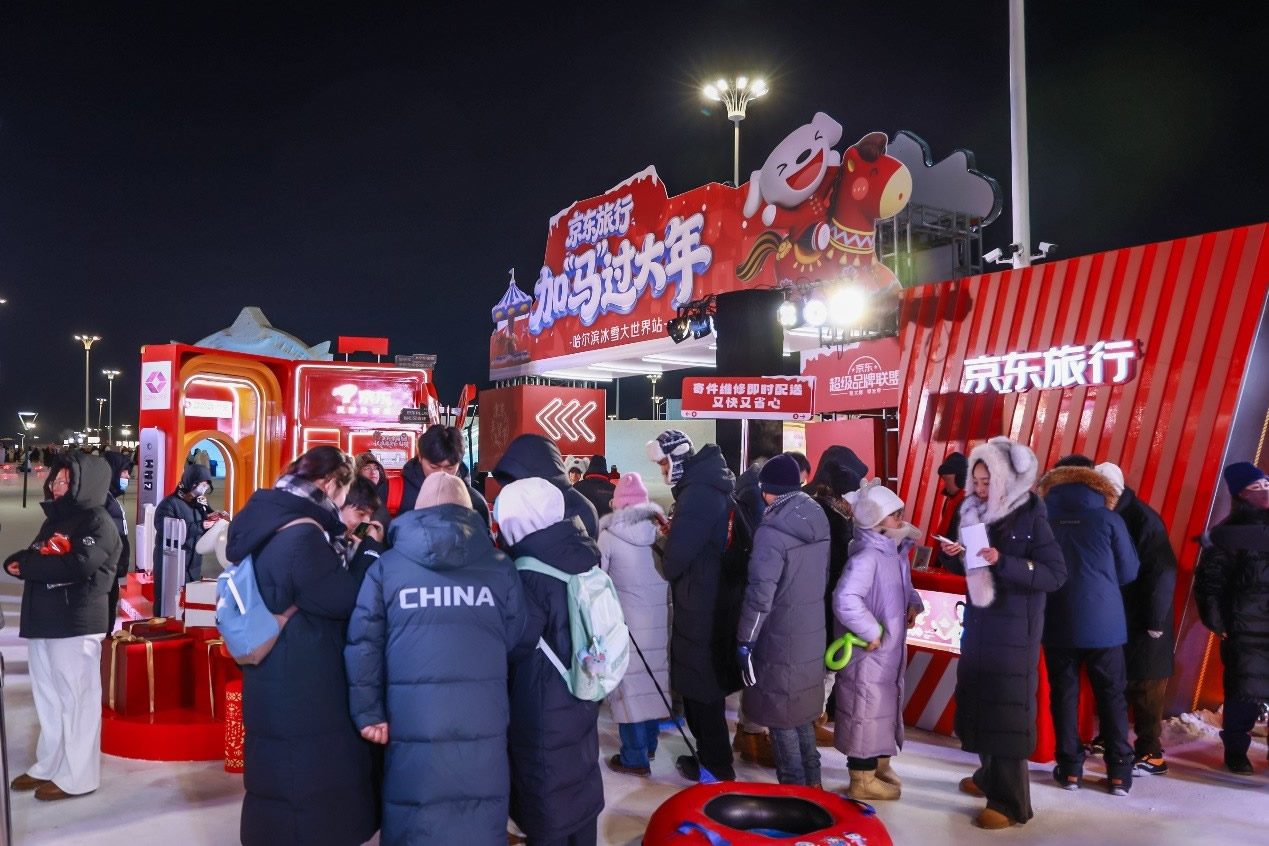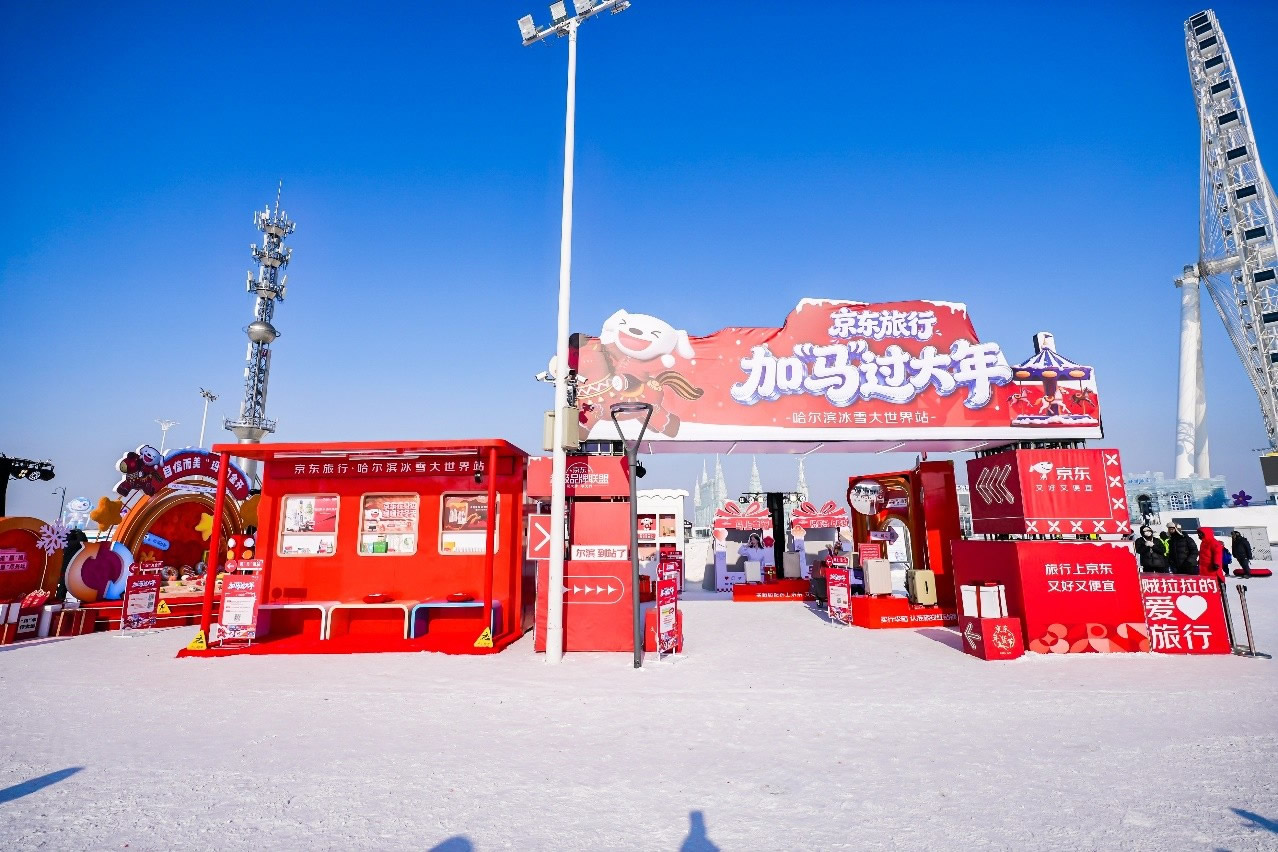 京東旅行在此次年貨節(jié)中深度融合兩大頂流文旅場(chǎng)景,實(shí)現(xiàn)線下事件與品牌傳播的雙重引爆。在哈爾濱冰雪大世界,京東旅行攜手京東箱包、京東健康、超級(jí)品牌聯(lián)盟、旅安、歐舒丹等品類品牌,依托其冬季頂流景區(qū)的話題熱度,通過(guò)多維互動(dòng)營(yíng)銷方式打造沉浸式跨界體驗(yàn):不僅設(shè)置“冰雪年貨快閃活動(dòng)”開(kāi)展品牌展示與互動(dòng)游戲,更通過(guò)地標(biāo)冰雪摩天輪、無(wú)人機(jī)表演、冰雪大舞臺(tái)廣告/立體字/主持人口播、區(qū)域植入品牌立體廣告等豐富營(yíng)銷形式,共同實(shí)現(xiàn)品牌與景區(qū)流量的深度共振。