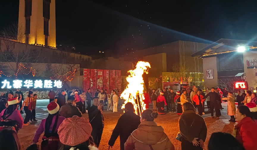 在京南華美勝地,游客們歡聚一堂,點(diǎn)燃跨年篝火,慶祝新年到來。