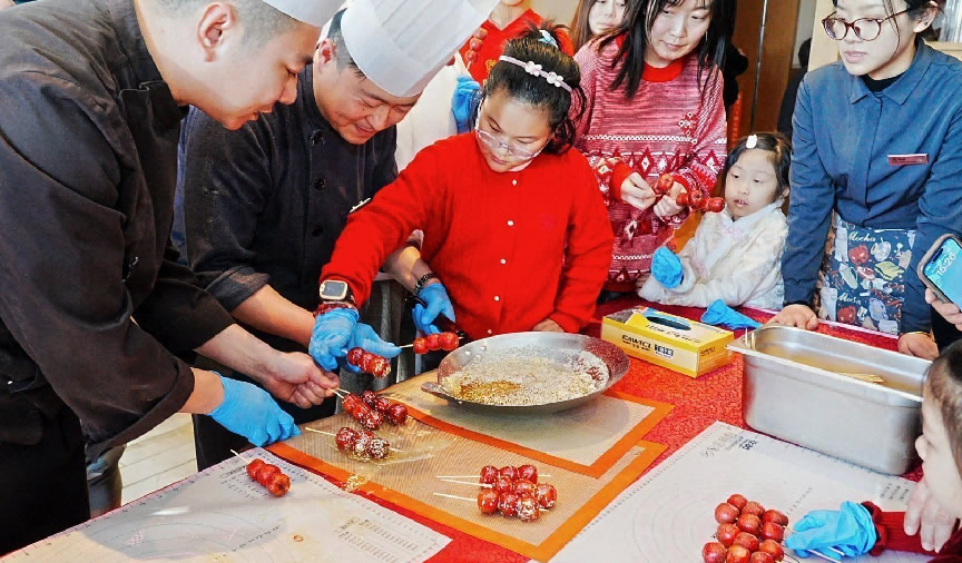 在工作人員的指導(dǎo)下,游客們體驗(yàn)手工制作糖葫蘆。