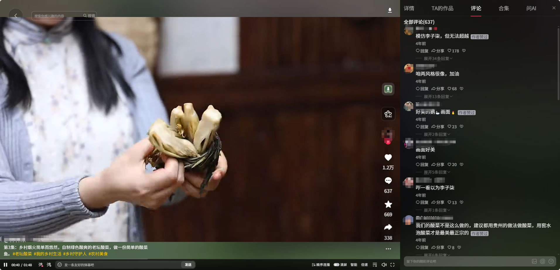 在短視頻追求短平快的年代,她卻反其道而行之。為了拍一滴醬油,她會從種黃豆開始;為了一床蠶絲被,她會從養(yǎng)蠶開始。這種動輒跨越四季的“一物一生”拍攝方式,在當時看來效率極低,但正是這種不計成本的投入,為“田園視頻”這個品類,樹立了一個極高的品質標桿。這個標桿,至今仍是很多人難以逾越的參照物。