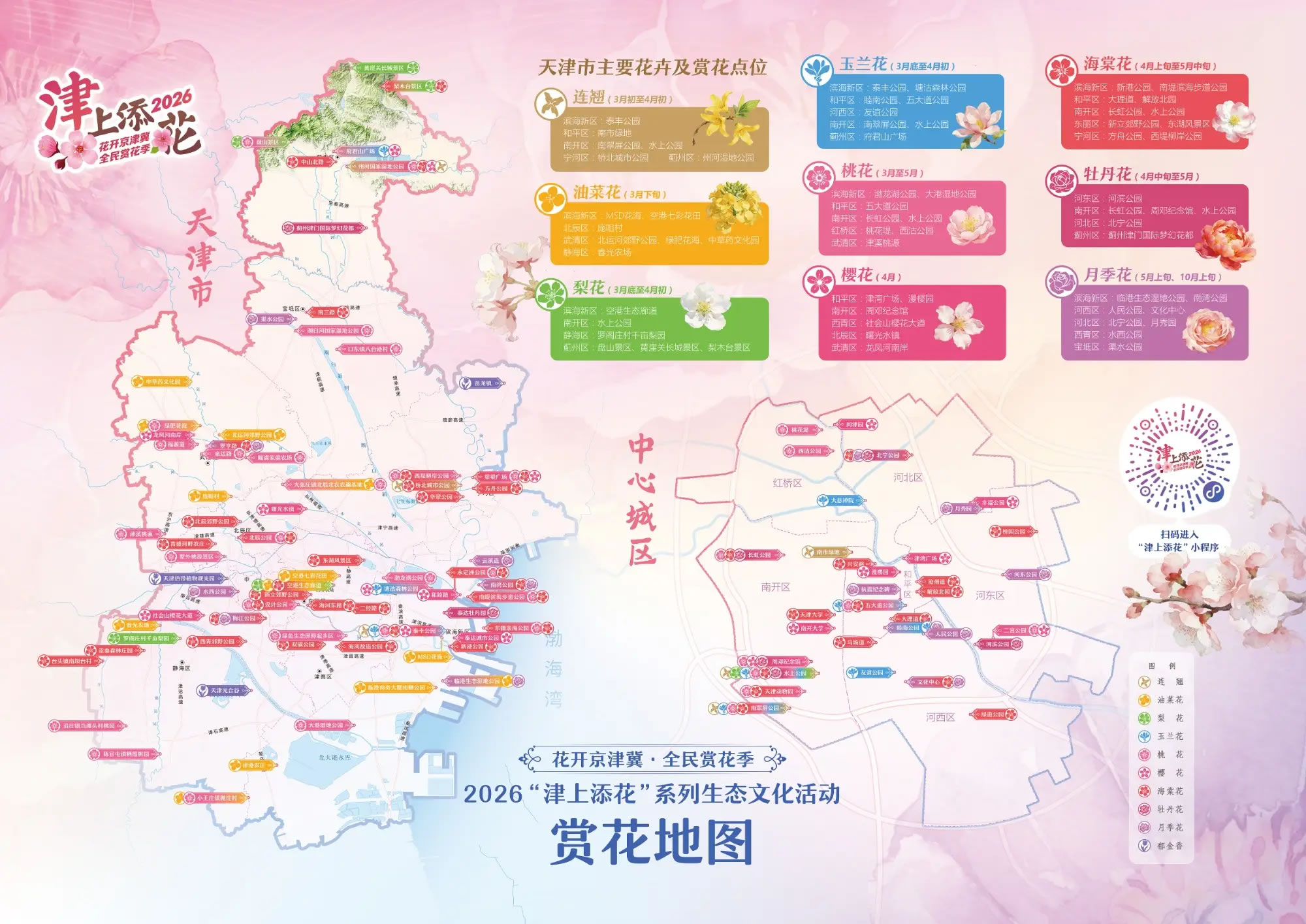 本次天津賞花活動覆蓋全域,配套發(fā)布的賞花電子地圖成為市民出游的實用指南,地圖清晰標(biāo)注各點位花期、交通等關(guān)鍵信息,方便大家定制專屬賞花路線。相較于往年,今年賞花點位從100個增至129個,不僅囊括傳統(tǒng)賞花勝景,還融入綠屏、古樹、非遺、觀鳥等元素,實現(xiàn)“四季有花、全域皆景”,白天賞繁花、夜晚看夜景的全時段觀賞體驗讓春日游玩更豐富。