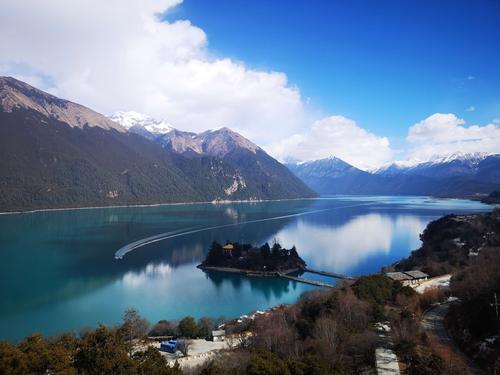 小島上有唐代的建筑“錯(cuò)宗工巴寺”,是西藏有名的紅教寧瑪派寺廟,建于唐代末年,距今已有1500多年的歷史了。錯(cuò)宗寺為土木結(jié)構(gòu),上下兩層,殿內(nèi)主供蓮花生、千手觀音和金童玉女。寺南有一株桃和松的連理樹(shù),春天時(shí),桃花與青松相映,煞是好看。