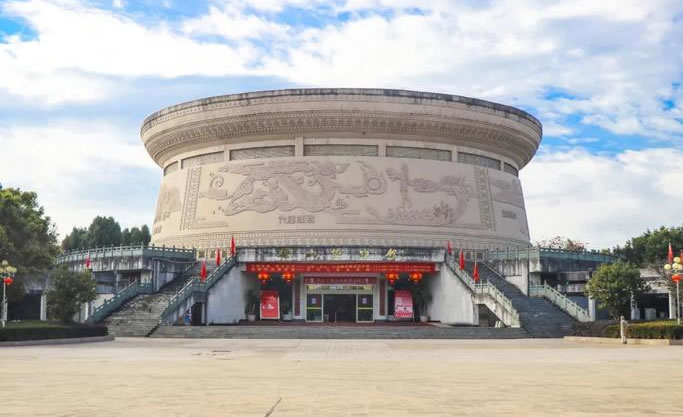 保山市博物館,位于保山中心城市文化中心(三館廣場(chǎng))正中,占地8畝,坐南朝北。館舍為仿本地出土古代銅鼓造型,通高19.6米,最大直徑56.6米。是保山市重要的標(biāo)志性文化設(shè)施。建筑面積4500平方米,展廳面積3000平方米。