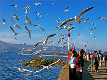滇池位于昆明市南的西山腳下,其北端緊鄰昆明市大觀公園,南端至?xí)x寧縣內(nèi),距市區(qū)5km,歷史上這里一直是度假觀光和避暑的勝地。滇池形似弦月,南北長(zhǎng)39km,東西寬13.5km,平均寬度約8km。湖岸線長(zhǎng)約200km;湖面面積300k㎡,居云南省首位,湖水最大深度8m,平均深度5m,蓄水量15.7億,素稱(chēng)“五百里滇池”。是中國(guó)第六大內(nèi)陸淡水湖。