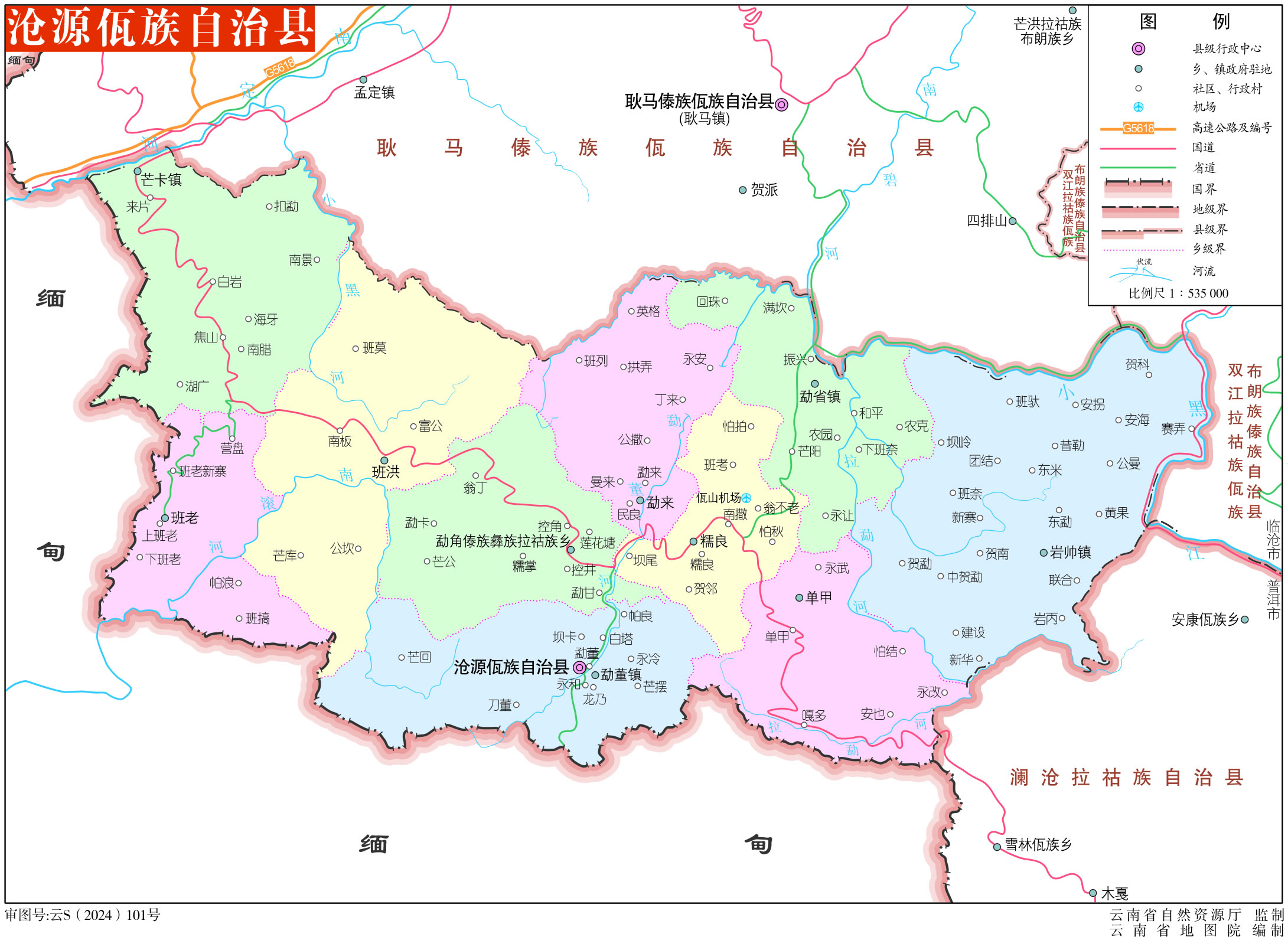 鄉(xiāng):單甲鄉(xiāng)、糯良鄉(xiāng)、勐來鄉(xiāng)、勐角傣族彝族拉祜族鄉(xiāng)、班洪鄉(xiāng)、班老鄉(xiāng)